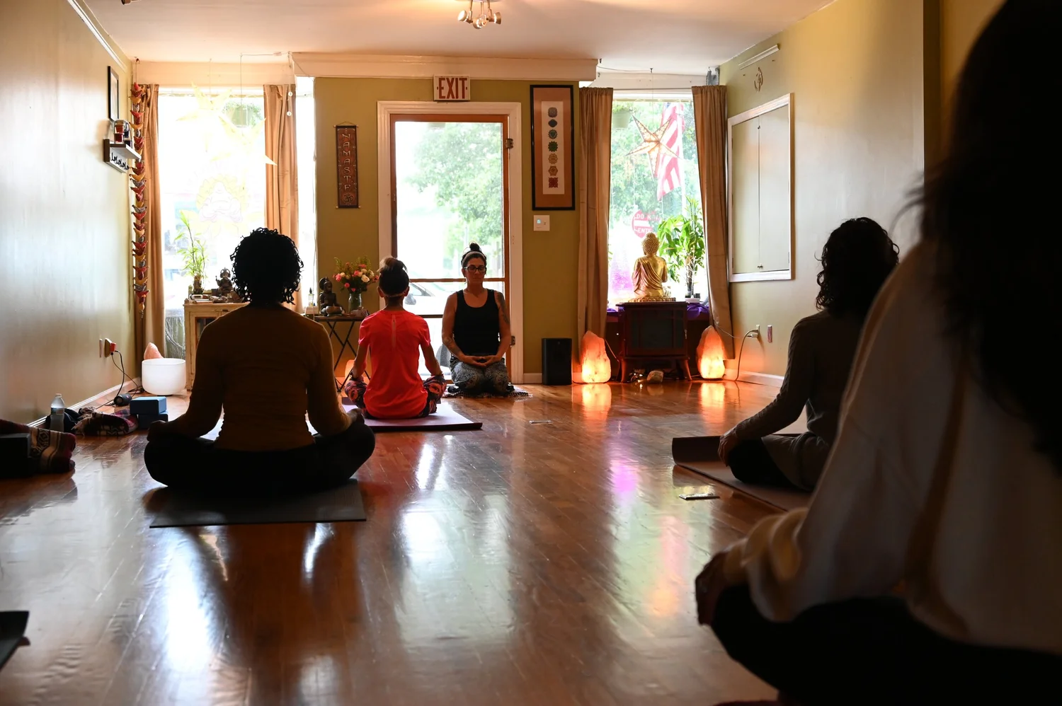 Exterior and interior view of Happy Buddha Yoga yoga studio in Goshen New York